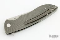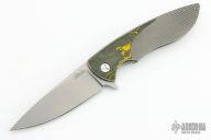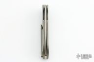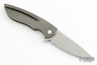This Sting Flipper by Herman Knives features a tumbled blade and flipper. The handle has a milled and tumbled titanium frame with fat carbon inlay, titanium liner and tip up clip and carbon fiber backspacer. Nice detent, lockup and blade seating. Rides on bearings.  Comes with original zippered case, COA dated 11/26/2021, pivot tool and extra bearings. Excellent condition.  #144
