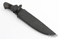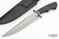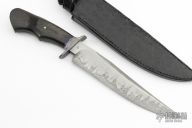 This Fighter by Journeyman Smith Ben Seward features a Damascus core San Mai blade with 410 SS cladding, nearly sharpened top edge, .252" blade stock and 1.637" blade depth, hidden tang construction. The handle has a wrought iron guard, fileworked blued steel spacer, bog wood grip with single nickel silver pin. Comes with a black leather sheath. Comes with a zippered case. Excellent condition.