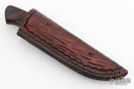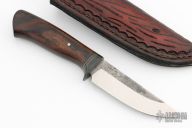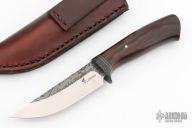 This Hunter by Jarrett Fleming features a satin finished blade with forged finished flats and a hidden tang construction.  .154" Blade Stock.  1.192" Blade Depth.  The handle has a micarta guard and a wood grip.  Includes a brown leather sheath.  Excellent Condition.