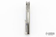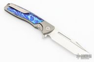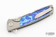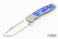 This Mini EVO Flipper from Brian Nadeau features a polished Damasteel blade with a fullers, thumbhole, flipper and notched thumbrest. The handle is comprised of a bead blasted titanium frame with Timascus inlays, satin titanium tip up clip. Rides on bearings, nice detent, lockup and blade seating, stainless lockface insert. Comes with original box. Excellent condition.