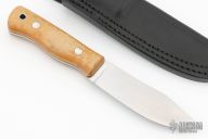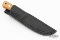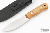 This Hunter by Dave Beck features a hand rub satin finished blade with .118" blade stock and 1.262" blade depth, full tang construction. The handle has butterscotch richlite scales with black liners. Comes with a black leather sheath. Excellent condition.
