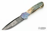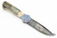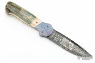 This Fighter from PJ Ernest features a Mosaic Damascus blade with false top edge, .141" blade stock and 1.283" blade depth, full tang construction. The handle is comprised of blued Damascus bolsters and mammoth ivory scales. Excellent condition. Comes with a Velcro case.