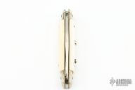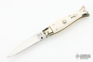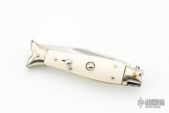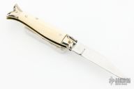 This Custom Picklock Auto by Picklock Pat Havlin features a hand ground mirror polished blade stamped "PLP". The handle is a factory Edwin Jay frame from the 1960s. Pat added Mammoth ivory scales, has nickel silver bolsters, brass liners, steel backspacer. Has safety. Excellent condition.