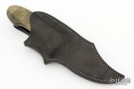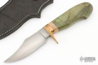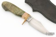 This knife by Journeyman Smith Jarrett T. Cieslak features a hand rub satin finished blade with hamon, .145" blade stock and 1.437" blade depth, hidden tang construction. The handle has a pinched and fluted silcone bronze guard, nicely figured stabilized curly maple grip. Comes with a black leather sheath and original box. New from maker!