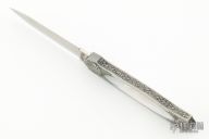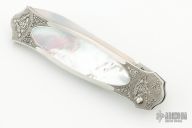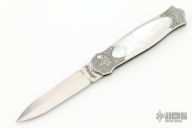 This Buttonlock Auto from Robert Sidelinger was designed to be quiet rather than snap your hand back. Yet, the action is positive. This knife was his signature knife. The blade has a hand rub satin finished dagger ground blade with false top edge. Has a stainless steel frame with mother of pearl inlays. The engraving is by "JD". (Jere Davidson) Has a couple very light scratches, otherwise excellent condition.