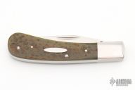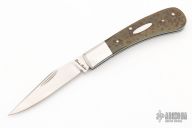 This Slipjoint by Dave Ricke features a satin finished drop point blade with a single nail nick. The handle features pinched steel bolsters complemented by dyed jigged bone covers. Half-Stop flush in the closed position.  Excellent Condition.