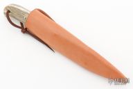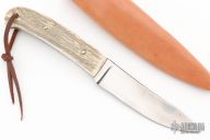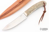 This knife by Mike Silvey features a satin finished blade with .186" blade stock and 1.171" blade depth, tapered tang construction. The handle has elk horn scale. Comes with a brown leather sheath. Excellent condition.