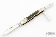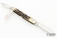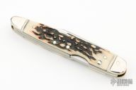 This Lockback Whittler by William Stoddart features mirror polished blades with nail nicks. The handle has fluted nickel silver bolsters, stag covers, brass liners, stainless steel springs. Has some light scratches, otherwise good condition. Comes with a zippered case.