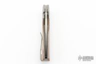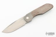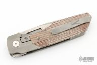 This Synapse XL First Run Folder by Vero Engineering features a tumble finish blade with notched thumbrest and flipper. The handle has a tumbled titanium frame with natural canvas micarta scales, tip up titanium clip with hidden screws. Rides on bearings, nice detent, lockup and blade seating. Comes with zippered case and patch. Excellent condition.