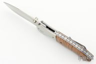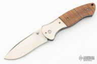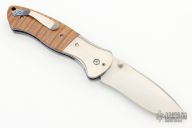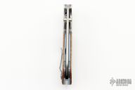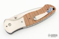 This knife by Patrick Nihiser features a satin finished blade with dual thumbstuds. The handle has polished titanium bolsters, curly maple scales, anodized titanium liners, fileworked titanium backspacer, and a tip up anodized titanium clip. Nice detent, action, lockup and blade seating. Has a few light scratches, otherwise excellent condition.