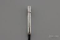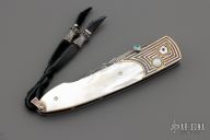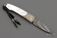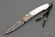 This B10 Aurora by William Henry features a Mike Norris 'Ribbon Lace' Damascus blade with single thumbstud with opal inset in gold bezel. The handle has a stainless steel frame with Koftgari inlaid 24kt gold, MOP scales, sterling silver lanyard bail with braided leather lanyard and beads. Comes with original box, sheath and COA dated october 25, 2006. Excellent condition.