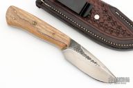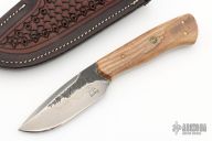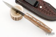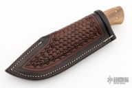 The Hunter by Matt Bailey was quenched in clay giving it a bold hamon, hand rub satin finish, .185" blade stock and 1.142" blade depth, full tapered tang construction. The handle has wood scales with nickel silver and mosaic pins. File worked tang. Comes with hand tooled brown leather sheath. Excellent condition.