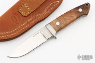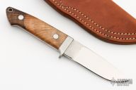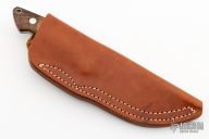 This fixed blade by Tim Steingass features a mirror polished drop point blade with notched thumbrest, .193" blade stock and 1.126" blade depth, full tapered tang construction. The handle has a stainless steel guard, wood scales over red fiber liners. Lanyard tube in pommel. Includes leather sheath with belt loop. Has some light scratches, otherwise excellent condition.