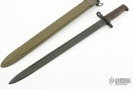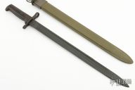 This is a very good condition U.S. M1905 bayonet dated 1913, originally made before WWI for the M1903 Springfield Rifle. It was then reissued in WWII for the M1 Garand Rifle, and fitted with a WWII Issue M3 fiberglass scabbard. The Garand was designed to take the same blade bayonet as the M1903 Springfield rifle, so at the beginning of the war they were issued with bayonets originally made for those rifles. Later in 1942 to keep up with wartime production, new orders for M1905 bayonets with plastic grips were sent out, which had plastic ribbed grips. These were also sometimes fitted to M1905 bayonets made previously that had damage to their wooden grips, however this example still retains the original wooden grips.