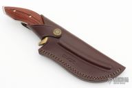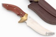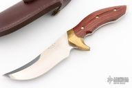 This 408 Kalinga Pro by Buck Knives features a stonewashed blade with false top edge, .158" blade stock and 1.437" blade depth, full tang construction. The handle has brass guard and dymondwood scales. Comes with a brown nylon sheath with button closure and belt loop. Has a few light scratches and patina, otherwise excellent condition.