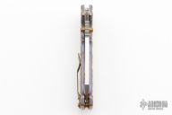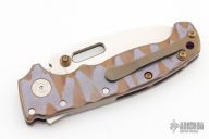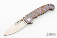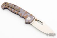 This AD20 by Andrew Demko features a hand ground hollow satin finished blade with notched thumbrest, thumbhole and dual thumbstuds.  The handle has an anodized titanium frame with a tip up anodized titanium clip and "Shark" lock release on the spine. Comes with original box and zippered case. MagnaCut Blade. Excellent condition.