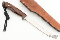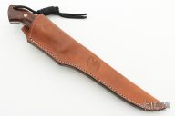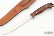 This Fillet Knife by Paul LeBatard features a satin finished blade with .097" blade stock and .713" blade depth, full tang construction. The handle has burl wood scales with black liners. Comes with a brown leather sheath. #1918. Has a couple small cracks in the wood, otherwise good condition.