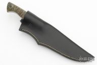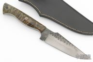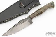 This Outdoorsman by Running Man Forge features a hand forged clip point blade with hand rub satin finished grinds and a nice hamon, .137" blade stock and 1.454" blade depth, full tang construction. The handle has maple burl wood scales with white liners, black canvas micarta and mosaic pins. Coms with black leather sheath and pamphlet from maker. New from maker!