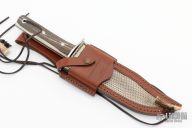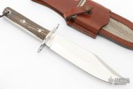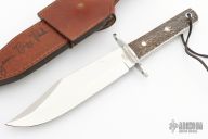 This Hand Made Bowie by Bull Dog Brand Knives features a satin finished blade with .188" blade stock and 1.7662" blade depth, full tang construction. The handle has a stainless steel guard and stag scales. Comes with a brown leather sheath signed on the back. Comes with original box. Excellent condition.