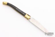 This Slipjoint by Laguiole features a satin finished clip point blade with a nail nick and a fileworked spine. The handle features brass bolster, brass liners, fileworked stainless steel backspring, horn covers. Excellent condition.