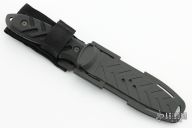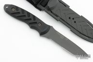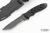 This knife by Gerber is called the Yari II, it features a black tanto partially serrated blade with full tang construction and black aluminum scales, .125" blade stock and 1.041" blade depth. Comes with a molded plastic sheath with belt loop. Has some scuffs, otherwise good condition.
