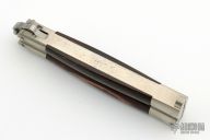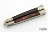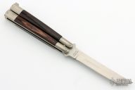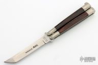 This Mandarin Balisong by Valor has a satin finished blade. Has metal handles with wood inlays and a T-latch. Has scratches, otherwise good condition.