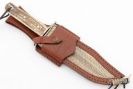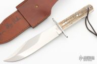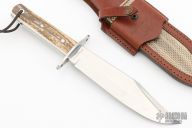 This Hand Made Bowie by Bull Dog Brand Knives features a satin finished blade with .188" blade stock and 1.7662" blade depth, full tang construction. The handle has a stainless steel guard and stag scales. Comes with a brown leather sheath signed on the back. Comes with original box. Excellent condition.