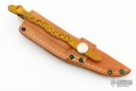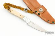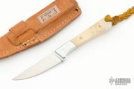 This knife features a satin finished clip point blade with a fileworked thumbrest and a full tang construction.  The handle features aluminum bolsters and elk horn scales.  The knife is marked "50th 1938-1988, Special Edition 44/100".  Includes a brown leather sheath and a padded zippered case.  Includes a COA.  Excellent Condition.