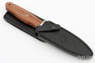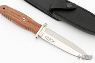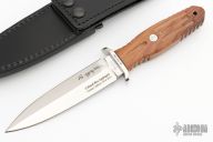 This Applegate-Fairbairn Combat Dagger by Boker Knives has a satin polish finished double edged spear point blade with .184" blade stock, 1.285" depth. The handle is comprised of a matching steel guard with black fiber spacer with Rosewood handle over hidden tang construction. Lanyard hole in pommel. Includes original box, papers, and leather sheath with belt loop. Numbered 015/199 on guard. Excellent condition.