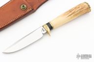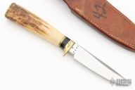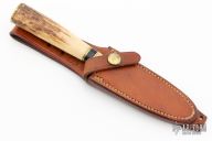 This Model G by Ralph Bone features a satin finished blade with swedge, .178" blade stock and .753" blade depth, hidden tang construction. The handle is comprised of an engraved brass guard, black and brass spacer, stag grip, engraved brass butt with the initials "CRV". Comes with brown leather sheath. #7891 on the blade. Excellent condition.