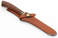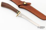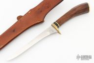 This Model I by Ralph Bone features a satin finished blade with .127" blade stock and .750" blade depth, hidden tang construction. The handle is comprised of brass guard, black and brass spacer, rosewood grip and a brass butt. #450 on the blade. Comes with brown leather sheath. Has some very light oxidation on the blade, otherwise good condition.