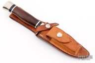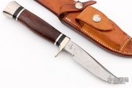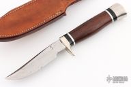 This Model G by Ralph Bone features a satin finished blade with swedge, .184" blade stock and .855" blade depth, hidden tang construction. The handle is comprised of nickel silver guard and butt, black and aluminum spacers, rosewood grip. #405 on the blade. Comes with brown leather sheath. Has some light patina, otherwise good condition.