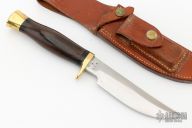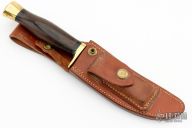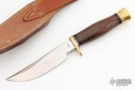 This Model D by Ralph Bone features a satin finished blade with swedge, .189" blade stock and 1.073" blade depth, hidden tang construction. The handle is comprised of brass guard and butt, black and brass spacers, rosewood grip. #116 on the blade. Comes with brown leather sheath. Has some light scratches, otherwise good condition.