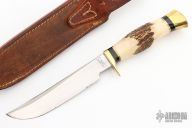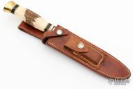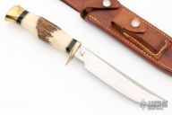 This Model D by Ralph Bone features a satin finished blade with swedge, .181" blade stock and 1.069" blade depth, hidden tang construction. The handle is comprised of brass guard and butt, black and brass spacers, stag grip. #312 on the blade. Comes with brown leather sheath. Has some light patina, otherwise excellent condition.