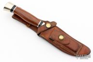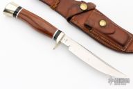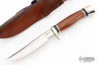 This Model G by Ralph Bone features a satin finished blade with swedge, .168" blade stock and .807" blade depth, hidden tang construction. The handle is comprised of nickel silver guard and butt, black and aluminum spacers, rosewood grip. #515 on the blade. Comes with brown leather sheath. Has some light scratches, otherwise good condition.