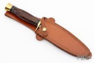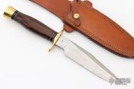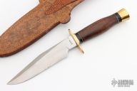This Model A Fighter by Ralph Bone features a satin finished clip point blade with a sharpened top edge, .189" blade stock and 1.240" blade depth, hidden tang construction. The handle has a brass double guard and brass butt cap, stacked leather grip with black and brass spacers. Has some very light scratches and patina, otherwise excellent condition. Comes with a brown leather sheath. Stamped A 523
