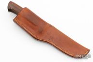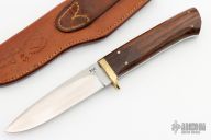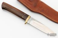 This Model FT by Ralph Bone features a satin finished blade with notched thumbrest, .191" blade stock and 1.065" blade depth, full tang construction. The handle has a brass guard and rosewood scales with brass pins. Coems with brown leather sheath. Has a couple light scratches, otherwise excellent condition.