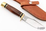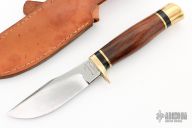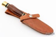 This Model U by Ralph Bone features a satin finished blade with swedge and checkered thumbrest, .174" blade stock and 1.189" blade depth, hidden tang construction. The handle is comprised of brass guard and butt, black and brass spacers, rosewood grip. #583 on the blade. Comes with brown leather sheath. Has some light scratches and patina, otherwise good condition.