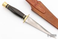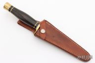 The Arkansas Toothpick (AT) was among the most labor intensive knives  made and introduced, early on, at the Ralph Bone Knife Company, due to its blade shape and the precise metalwork required.  This AT was the 111th example made by the Company.   The most popular blade length was 12”.   Accordingly, the AT was priced, up there, just below the retail prices of the Classic Bowie and Mexican Bowie.  Huxley