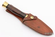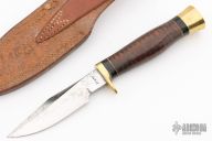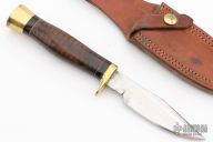 This Model H by Ralph Bone features a satin finished blade with sharpened top edge, .189" blade stock and .951" blade depth, hidden tang construction. The handle has a brass guard, black and brass spacer, stacked leather grip. #595 on the blade. Comes with brown leather sheath. Has some light scratches and light pitting on the blade, otherwise excellent condition.
