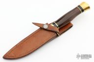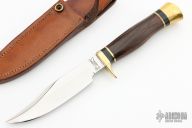 This fixed blade was made by Ralph Bone for Orvis. It features a clip point satin finish blade with sharpened top edge, .173" blade stock and 1.048" blade depth, hidden tang construction. The handle is comprised of a brass guard and butt , black and brass spacer, rosewood grip. Includes a brown leather sheath with belt loop. Has some minor patina on the blade from age, otherwise excellent condition for its age.