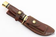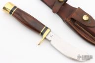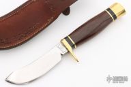 This Model T by Ralph Bone features a satin finished blade with notched thumbrest, .242" blade stock and 1.079" blade depth, hidden tang construction. The handle is comprised of brass guard and butt, black and brass spacer, cocobolo grip. #159 on the blade. Has some light scratches, has been resharpened, otherwise good condition. Comes with a brown leather sheath with "Carl Kracht" on the back.
