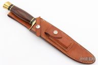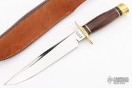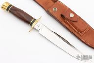 This Model A Fighter by Ralph Bone and Charles Hipp features a satin finished clip point blade with a sharpened top edge, .235" blade stock and 1.197" blade depth, hidden tang construction. The handle has an engraved brass double guard and brass butt cap, rosewood grip with black and brass spacers. Excellent condition. Comes with a brown leather sheath. Stamped A 78.3