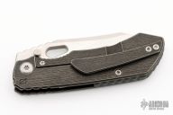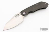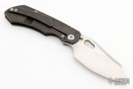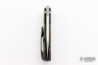 This Evolution 3.0 by Custom Knife Factory features a satin finished blade with notched thumbrest and thumbhole. The handle has a stonewashed bark finished titanium frame with a backspacer. Timascus pivot collars and clip. Comes with velcro case, additional clip, and COA. Nice detent, lockup and blade seating. Excellent condition. #410 and dated 8-22.