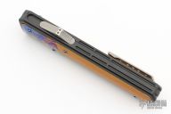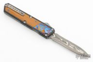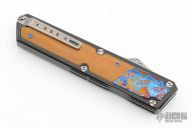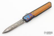 This OTF by Patrick Famin features a San-Mai Damascus dagger blade. The handle features an aluminum frame with micarta and Timascus inlays. Anodize finish hardware. Tip down titanium pocket clip. Excellent condition.