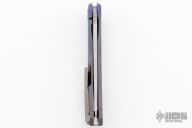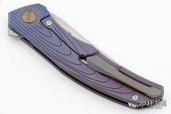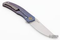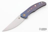 This Quantum "Solar System" by Shirogorov features a tumble finish blade with notched thumbrest and flipper. The handle has a blasted, anodized and milled titanium frame, has various exotic material inlays, bead blasted tip up titanium clip with hidden screws. Rides on SRBS, nice detent, lockup and blade seating. Cromax PM blade steel. Has a couple very light marks on the clip, excellent condition. Comes with original box and COA.