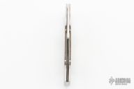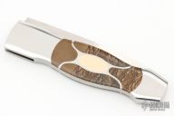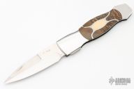 This Self Lock Interframe folding knife by Scott Sawby features a hand rub satin finished chute grind blade with false top edge and a nail nick. The handle has a polished stainless steel frame with petersite inlays and gold escutcheons. Nice lockup and blade seating. Excellent condition.