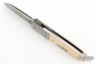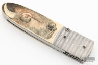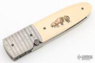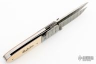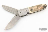 This knife by Kit Carson features Damascus blades with checkered thumbstud. The handle has Damascus dovetailed bolsters, scrimshawed mammoth ivory scales with red liners, jeweled stainless steel liners and backspacers. Marked "Patent Pending" inside handle on liner of drop point blade. Marked "006" on the blade. "Most Innovative Design Blade Show '04". Excellent condition. Scrimshaw by Susan Davenport 2-95