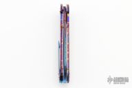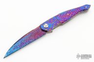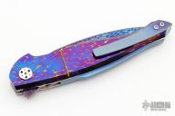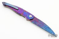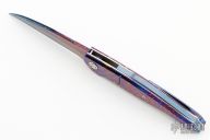 This linerlock flipper by Sergio Consoli features a Bertie Rietveld Dragonskin Damascus blade with notched flipper. The handle has timascus scales, Inox steel liners, anodized titanium backspacer and tip up clip. Sergio's ball bearing system gives the knife an effortless flip that requires no wrist action. Nice lockup, detent and blade seating. Outstanding work. Excellent condition. Comes with zippered case and COA dated January 2019.
