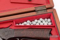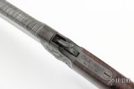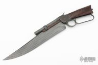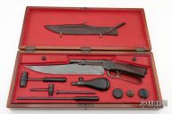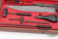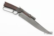 This "Winchester" Cut and Shoot by Javier Vogt and CAS Knives. It is truly stunning and features a Damascus blade with false top edge, .209" blade stock and 1.875" blade depth, full tang construction. Has a twist Damascus .44 caliber barrel, blued steel engraved fittings, curly wood stock and barrel mount, Damascus trigger, blued steel lever, Damascus butt plate with blued steel lanyard bail. Comes with a hand tooled brown leather sheath with reptile skin inlay. Comes with twist Damascus and black wood powder horn, ram rod, tools, mallet, wooden patch boxes, .44 caliber lead balls. All sits in a custom fit wooden box. This is one stunning set that could be the center piece of ANY collection. Excellent condition. Engraving done by Cristian Silva, Box made by Guillermo Scarilli.